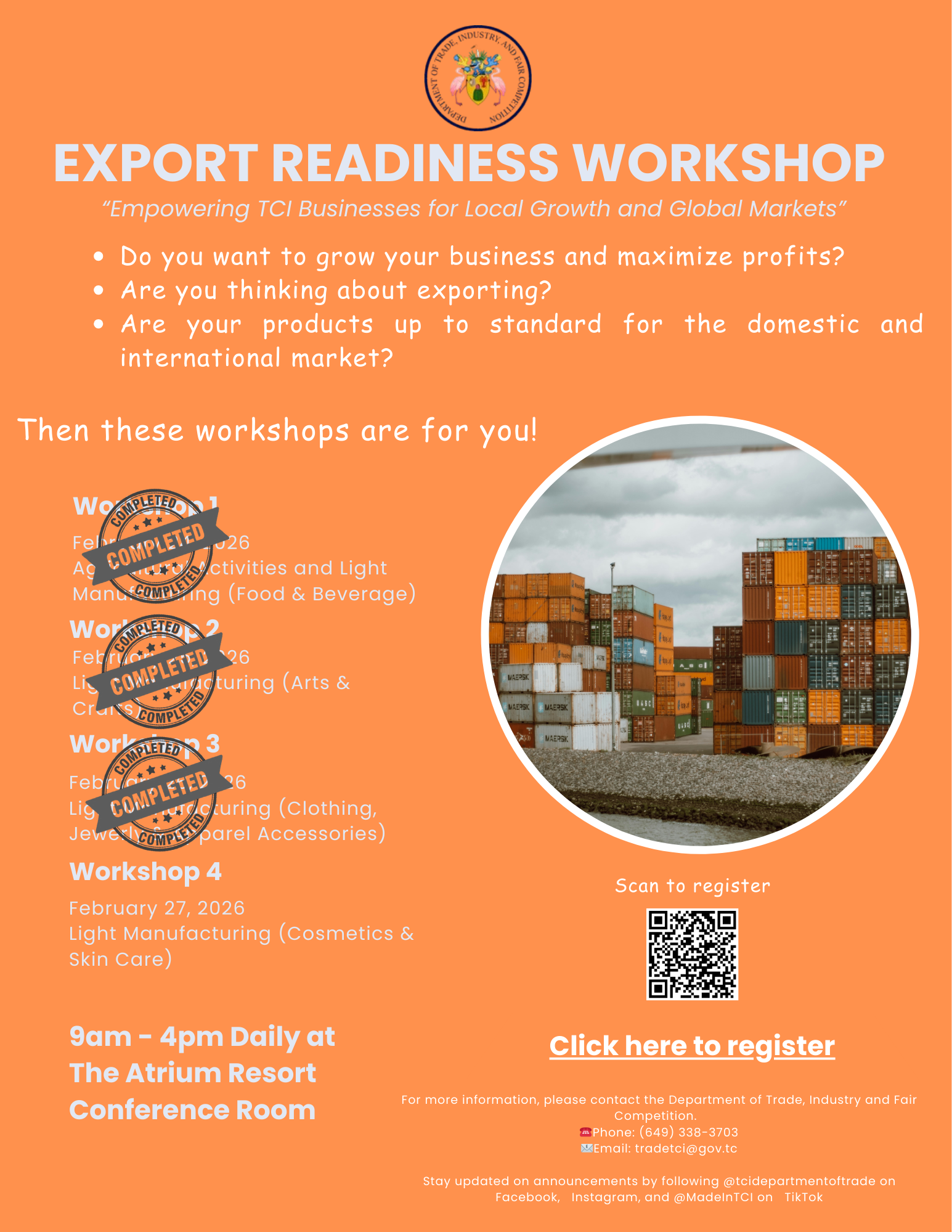 Stay updated on announcements by following @tcidepartmentoftrade on Facebook, Instagram, and @MadeInTCI on TikTok