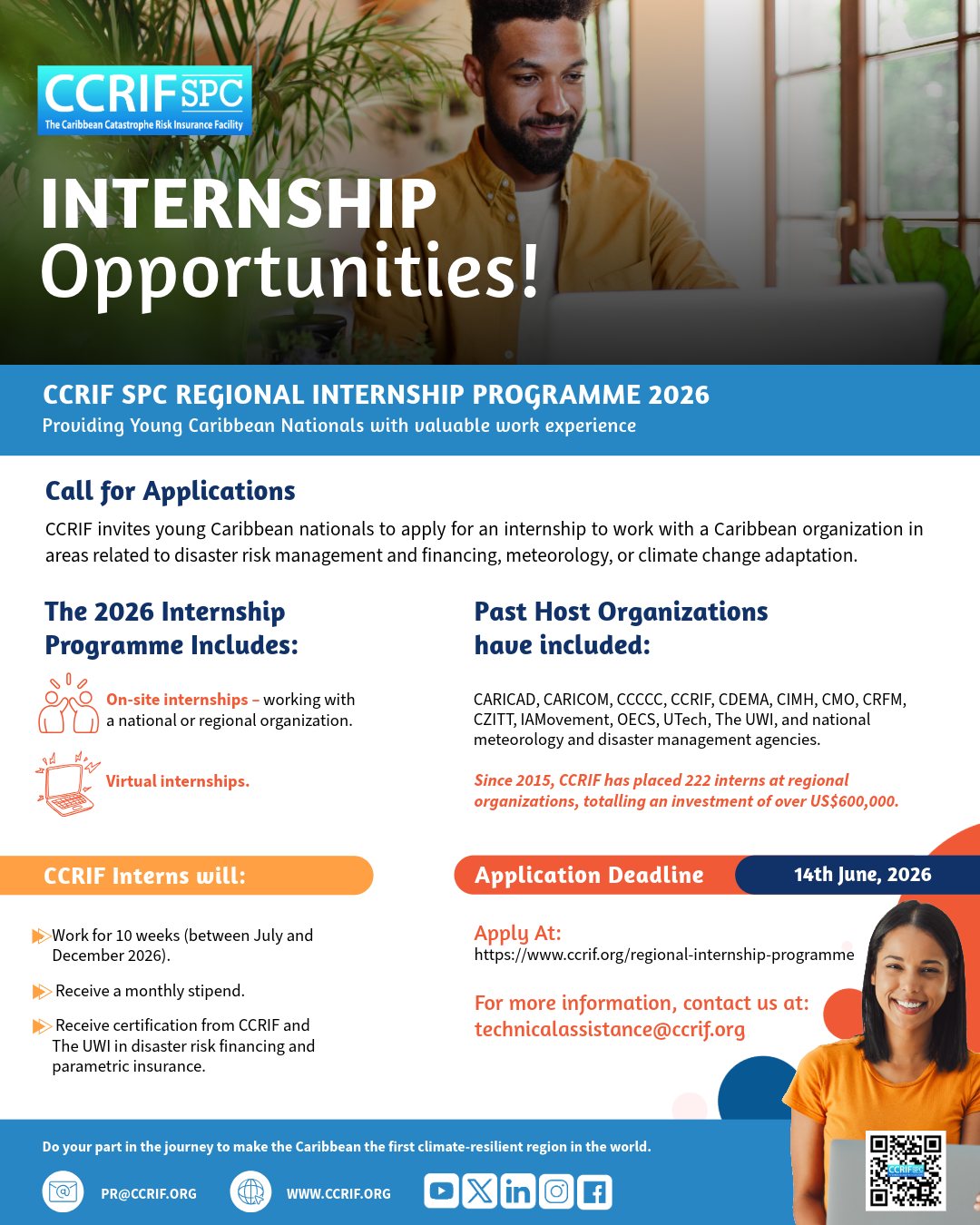 Explore our 2026 Internship and Scholarship Programmes, designed to strengthen skills, expand opportunities, and build resilience across the region. CCRIF has already invested over US$3 million in Caribbean youth - through 200 scholarships, 222 internships, and training opportunities. These programmes are building a pipeline of Caribbean professionals equipped to manage the realities of a multi‑hazard environment.