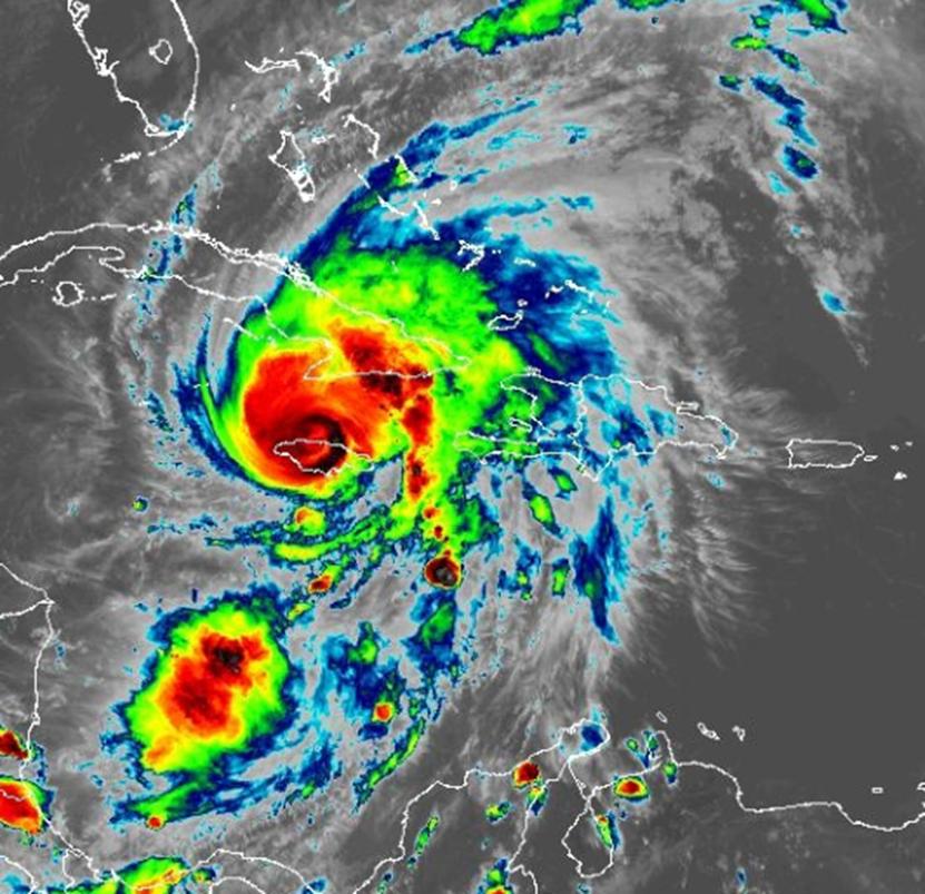 At 5 PM EDT, the eye of Hurricane Melissa was located near latitude 18.5 degrees north and longitude 77.7 degrees west, or about 15 miles east of Montego Bay, Jamaica, 280 miles Southwest of Duncan Town, Ragged Island, 330 miles Southwest of Salina Point, Acklins, 310 miles South-Southwest of Matthew Town, Inagua, 415 miles South-Southwest of Providenciales, Turks and Caicos Islands, 405 miles South-Southwest of Abraham’s Bay, Mayaguana, and 450 miles South of New Providence.