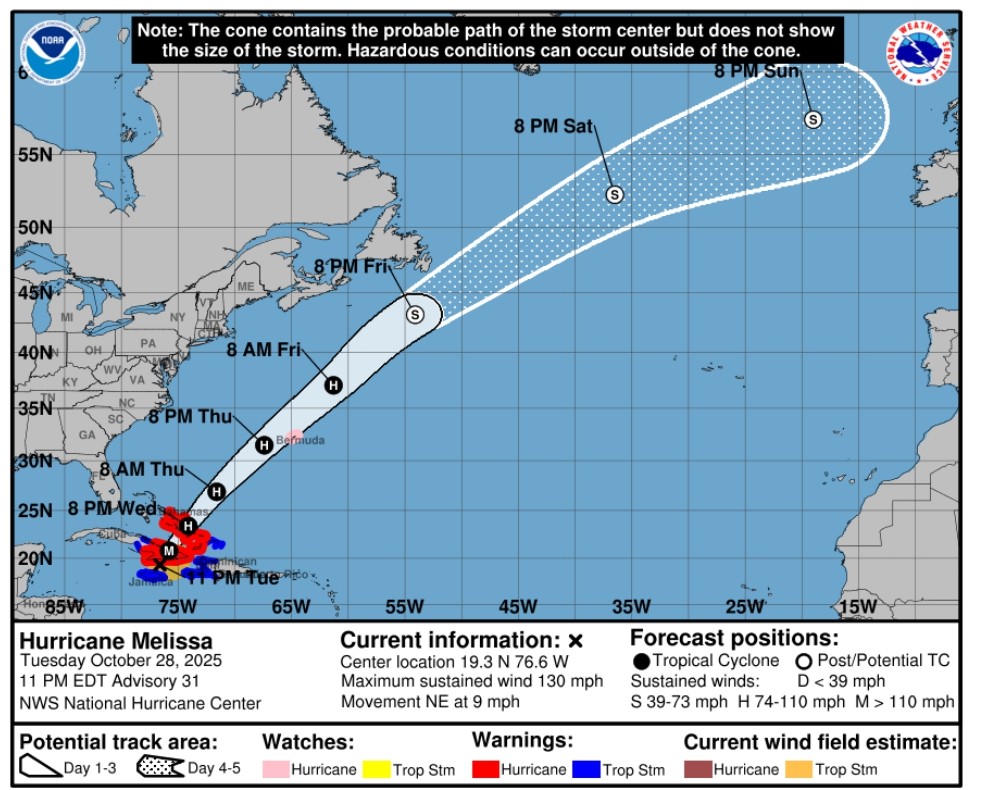 Hurricane Melissa is moving toward the Northeast near 12 miles per hour. A faster northeastward motion is expected during the next few days. On the forecast track, the core of Melissa is expected to cross Eastern Cuba through this morning, move across the Southeast or Central Bahamas later today and pass near or to the west of Bermuda on Thursday night.