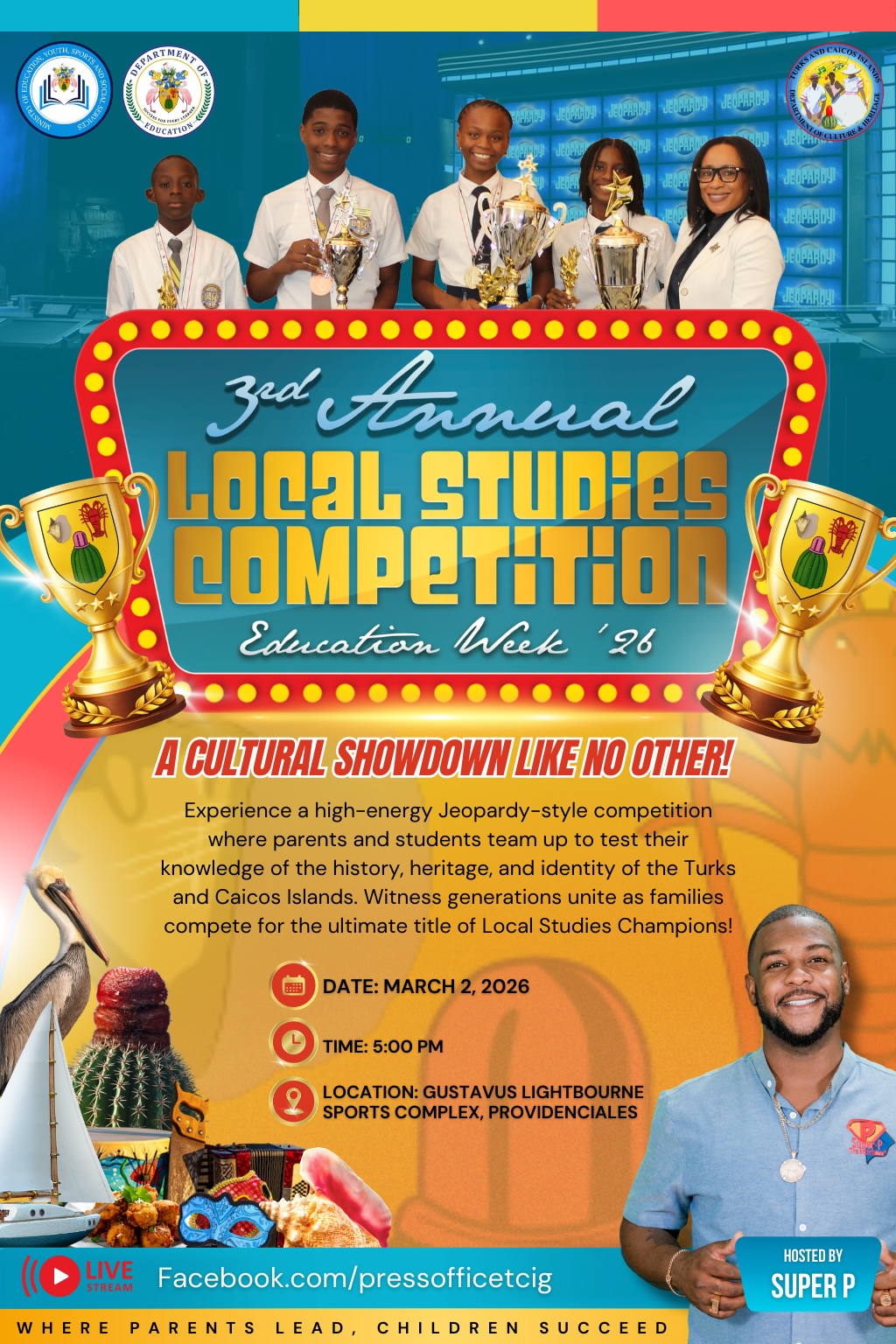 Providenciales, Turks and Caicos Islands – Friday, 27th February 2026: The 3rd Annual Local Studies Competition will take place on Monday, 2 March 2026 at 5:00 p.m. at the Gustavus Lightbourne Sports Complex. The event is set to deliver a suspenseful and exhilarating showcase of knowledge as students from across the Turks and Caicos Islands compete in a dynamic Jeopardy-style format. Participants will be tested on their understanding of the nation’s history, heritage, geography, and national identity in an exciting display of academic excellence and cultural pride.
