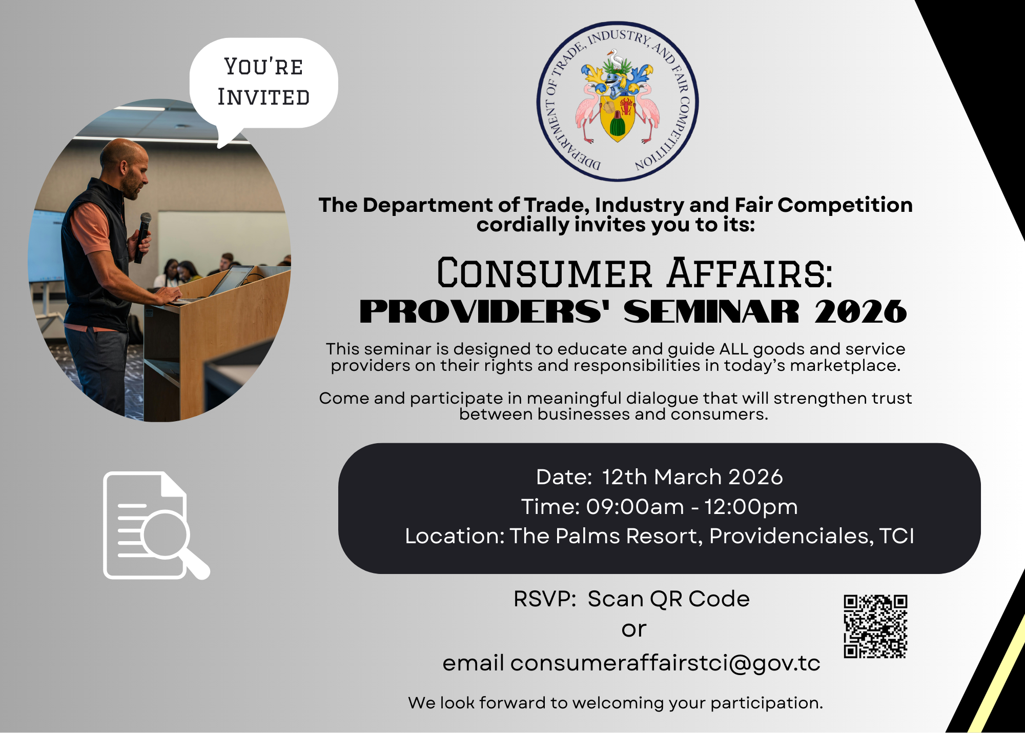 Providenciales, Turks and Caicos Islands – Friday, 20th February 2026: The Department of Trade, Industry and Fair Competition (DTIFC) is pleased to present the Consumer Affairs Providers Seminar 2026, scheduled for March 12, 2025, at the Palms Resort, Providenciales, Turks and Caicos Islands.